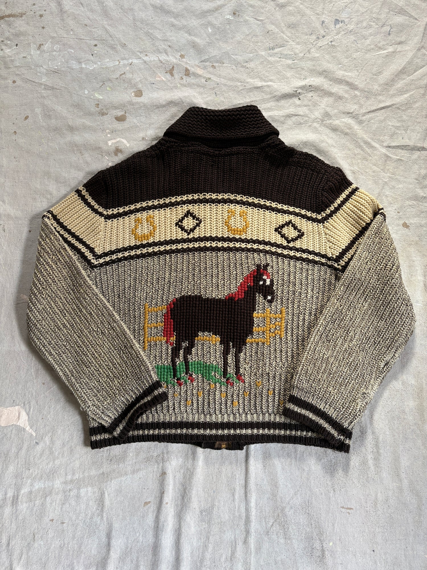 Incredible horse theme sweater. Zip front, hip pockets.