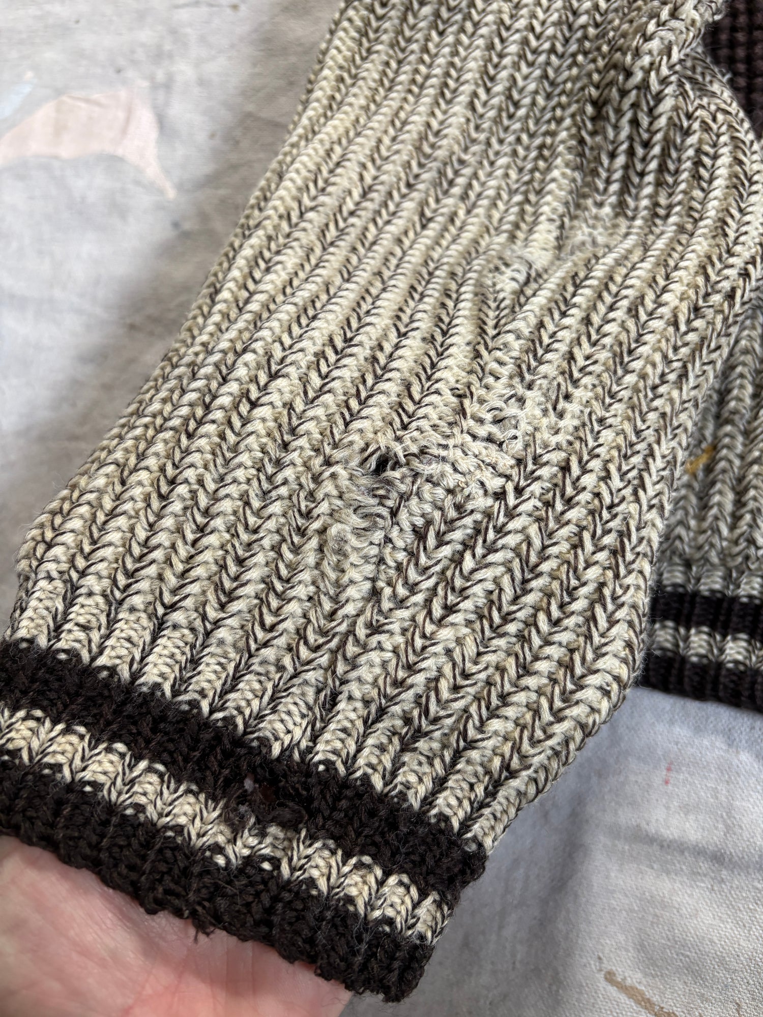 Wear and holes forming at the inner sleeve seams. Hole at underarm. Some lifted stitches at the pocket adornment. Fraying near the zipper. Please carefully review photos.