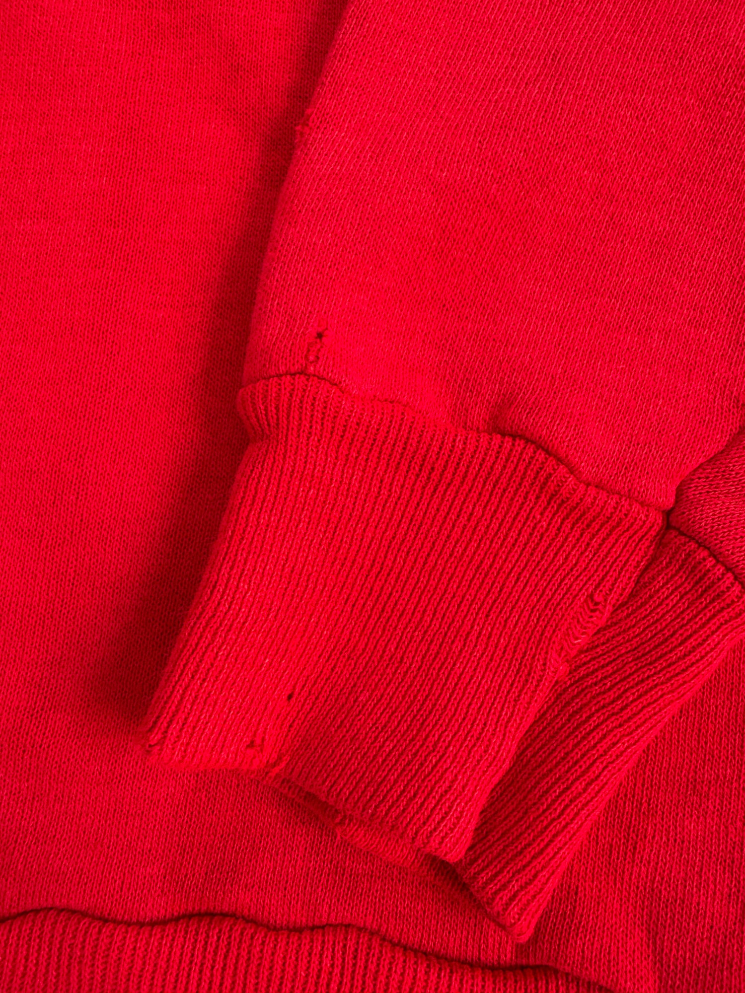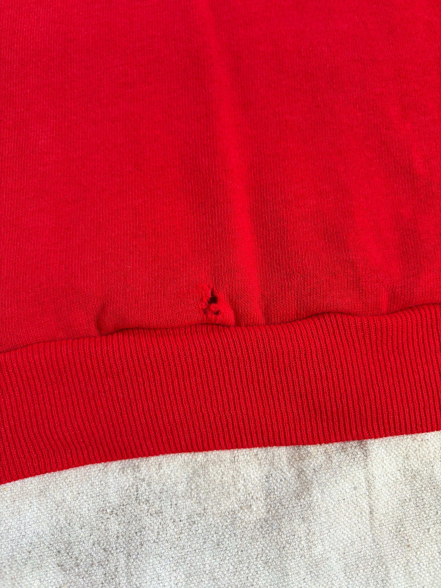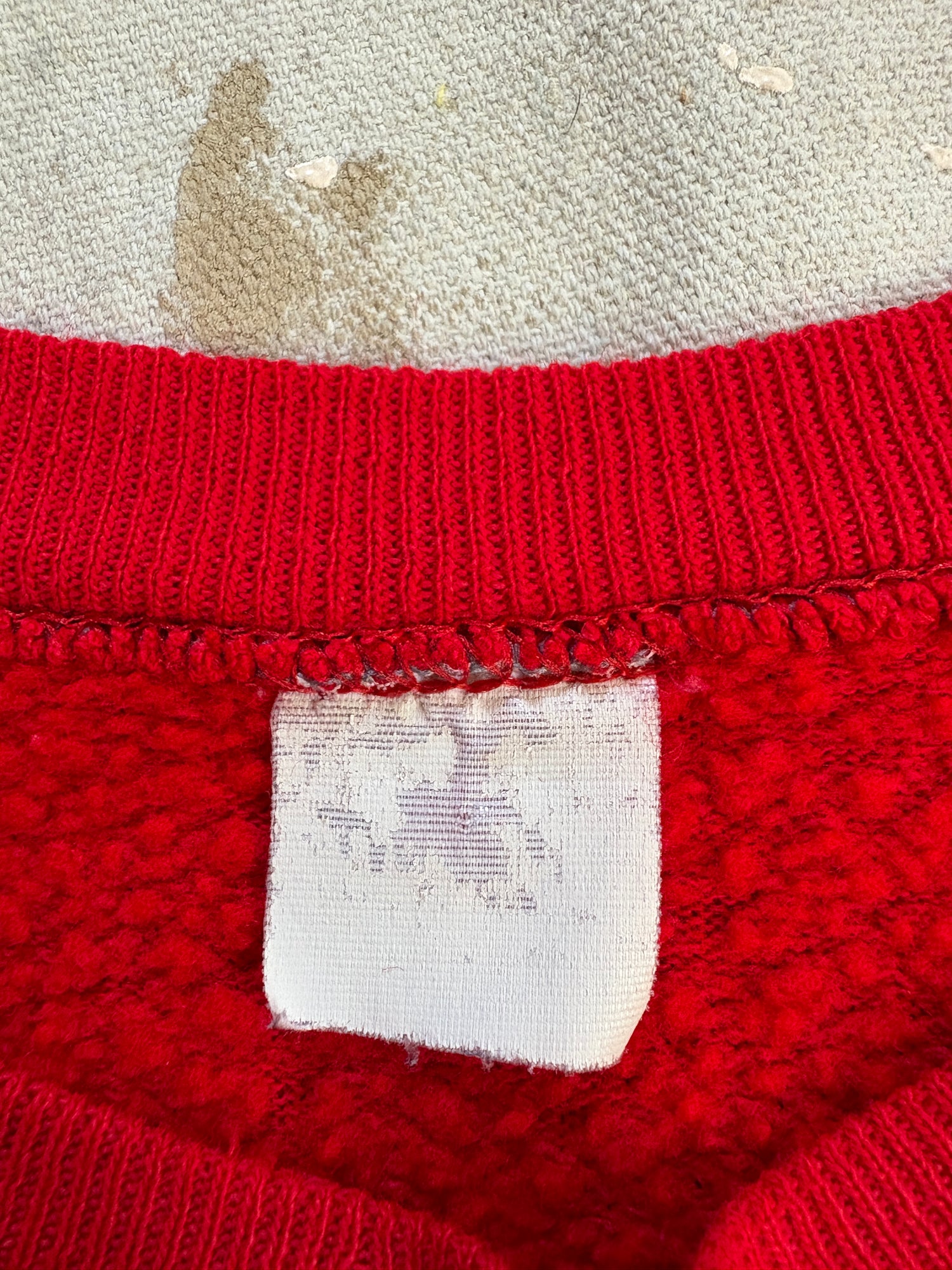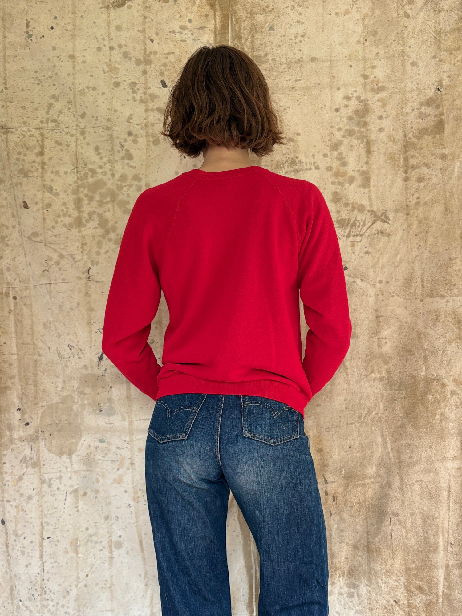 Crewneck, raglan sleeve, pullover sweatshirt. Likely a blend of cotton and polyester. Super cozy!