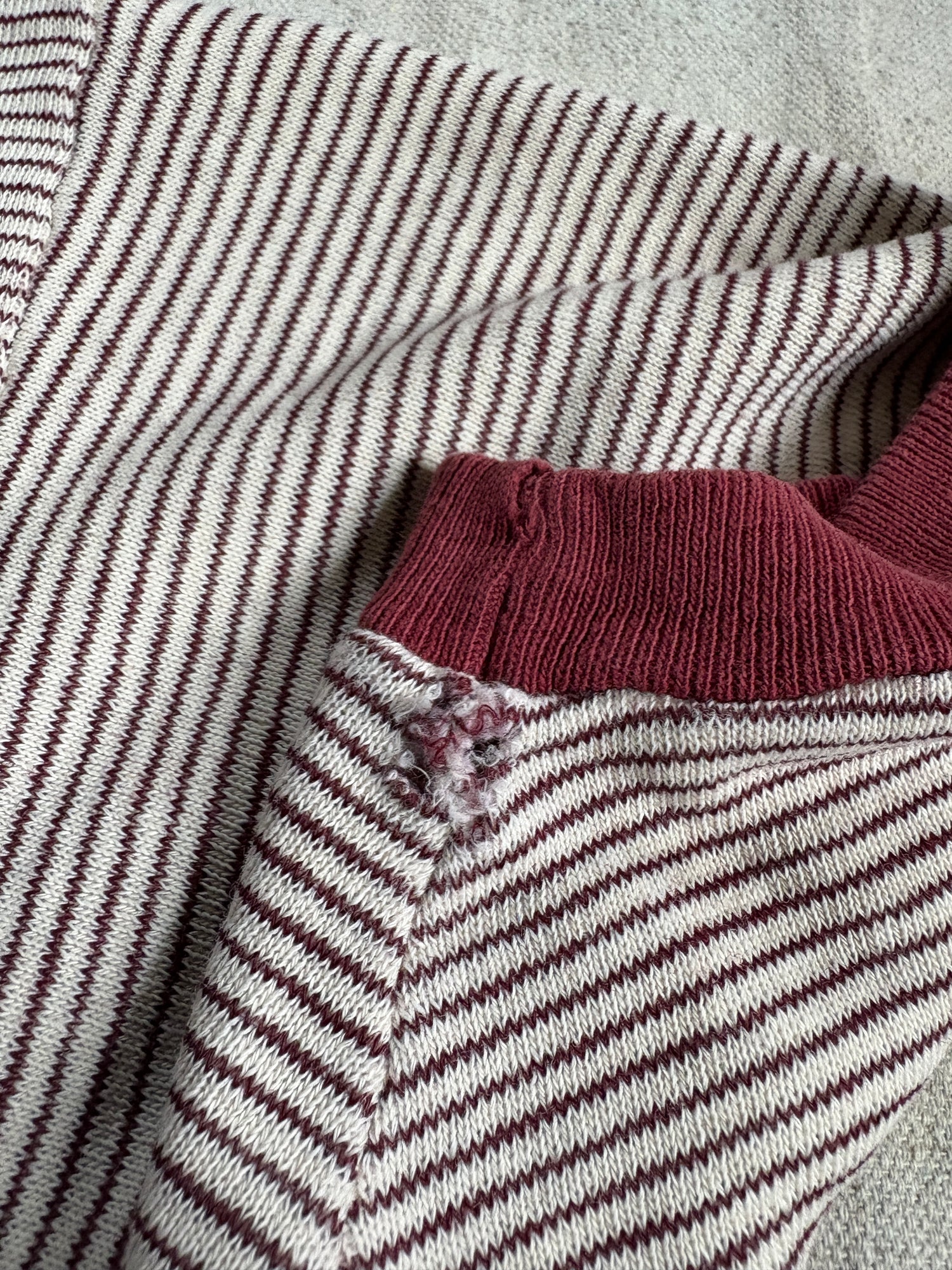 Large hole at shoulder seam. A few other smaller holes, a couple mends, some faint staining. Please carefully review photos.