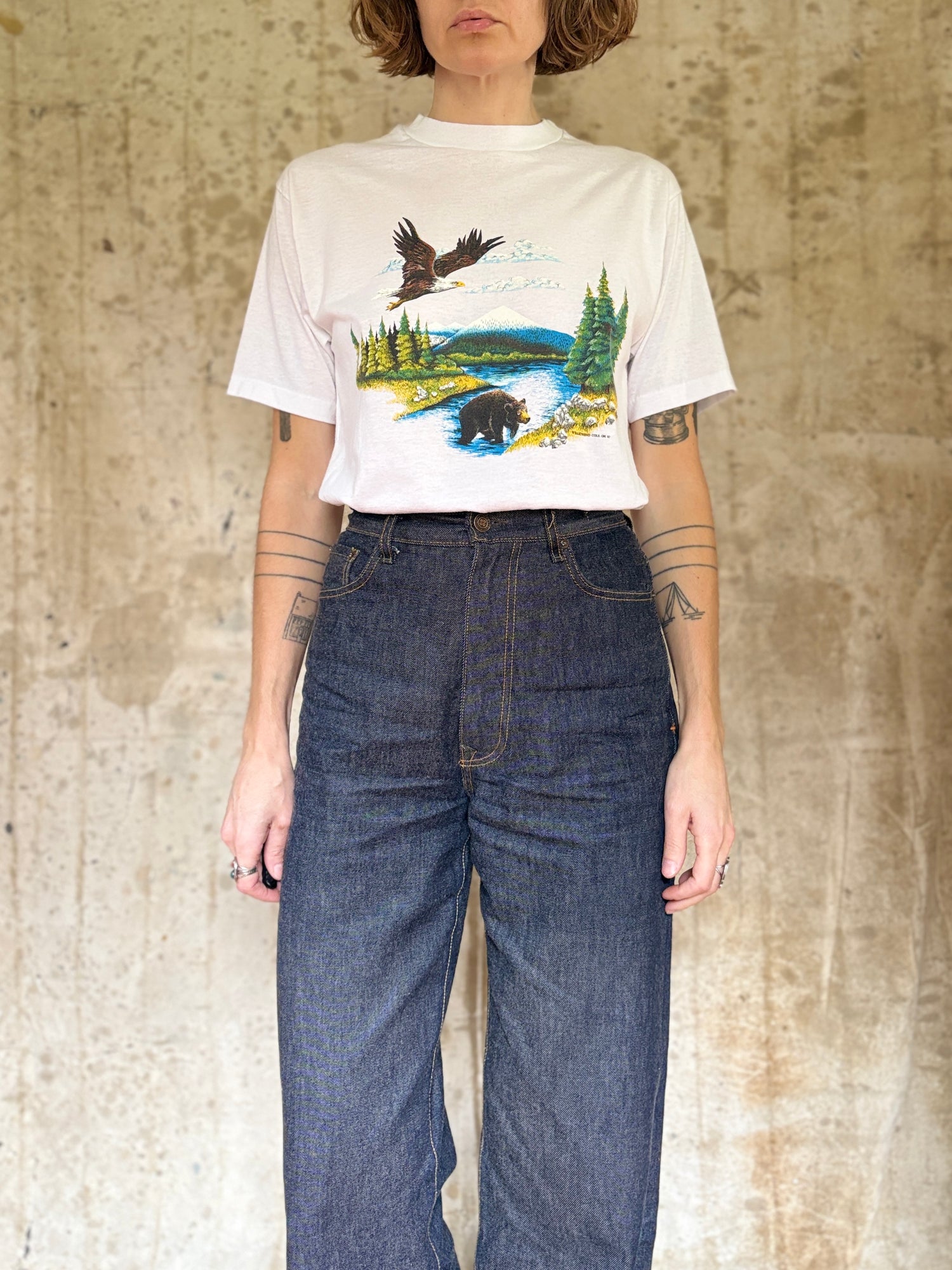 80s Bear And Eagle Mountain River Scene Nature Tee