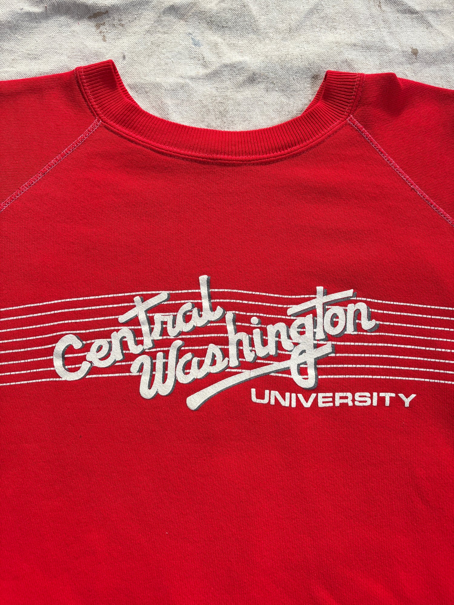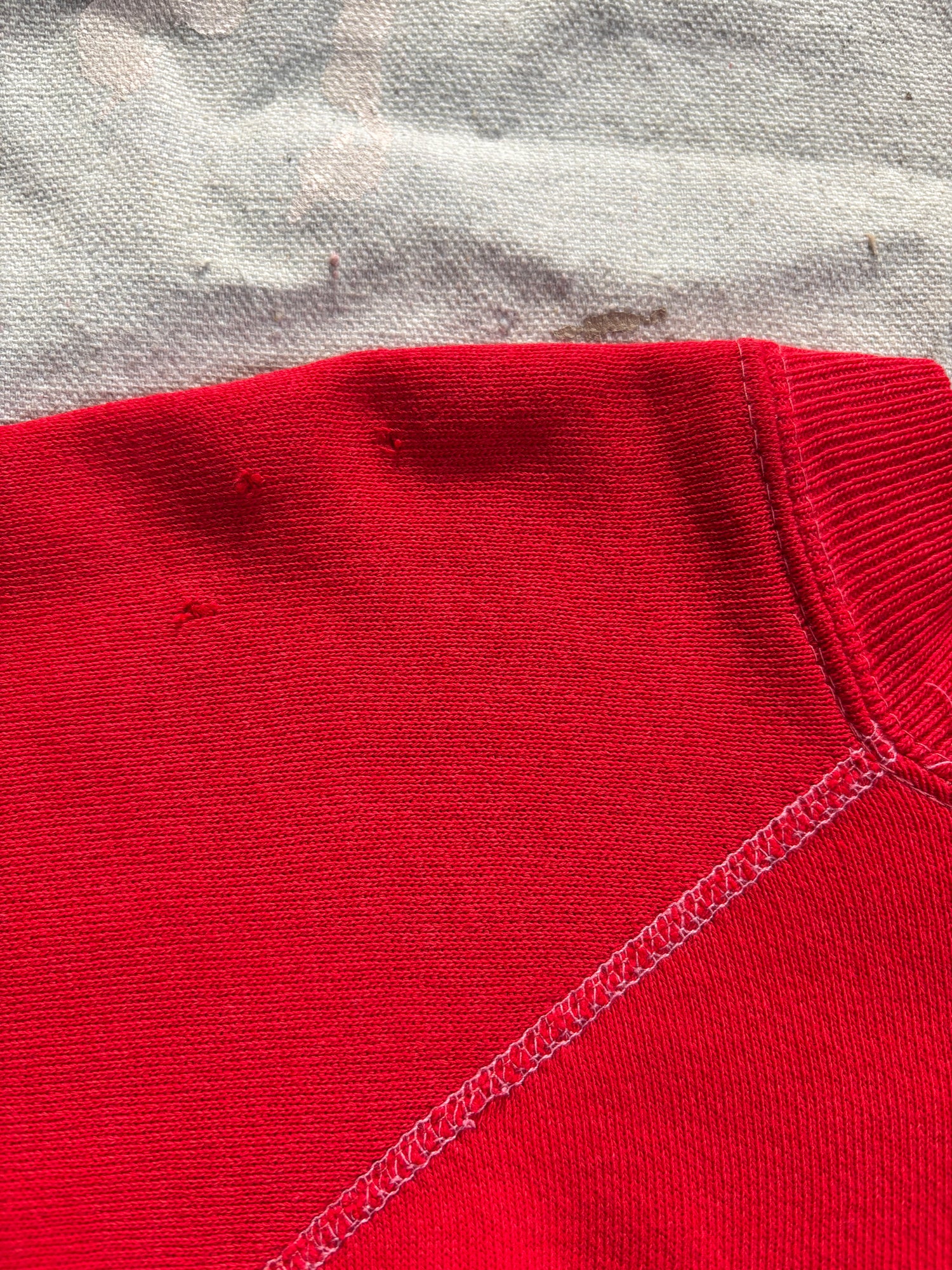 Crewneck, raglan sleeve, pullover sweatshirt. Likely a blend of cotton and polyester.