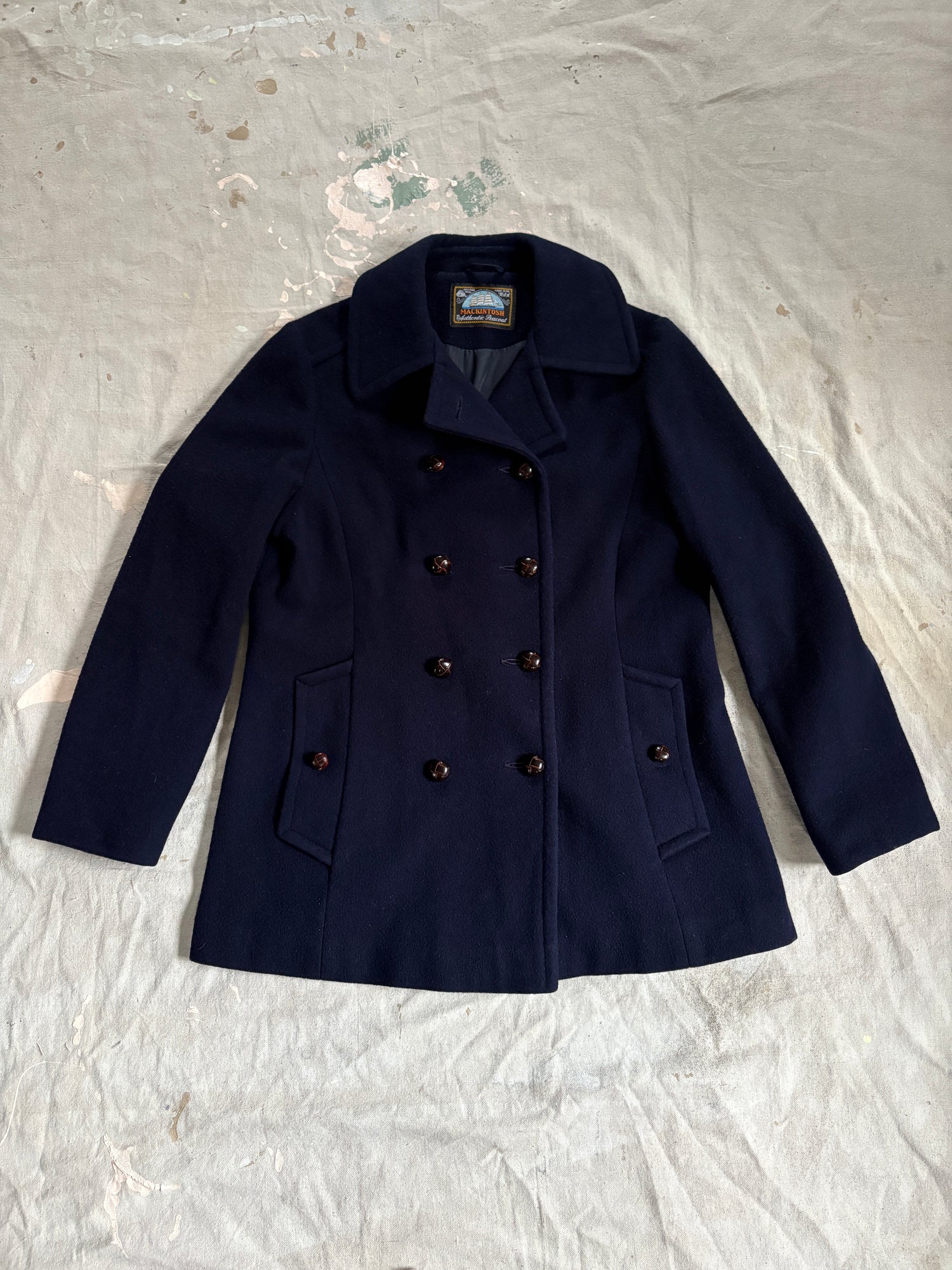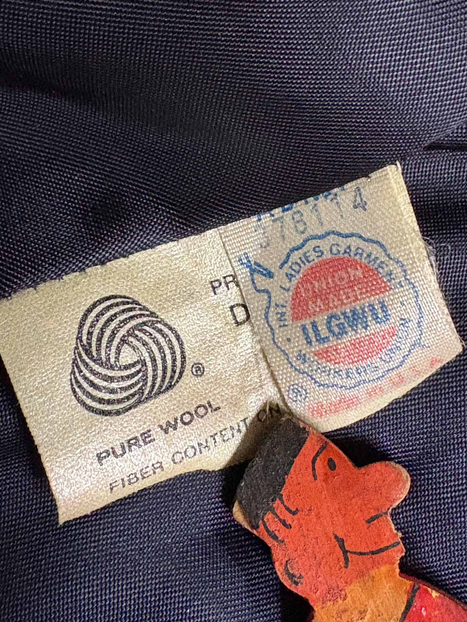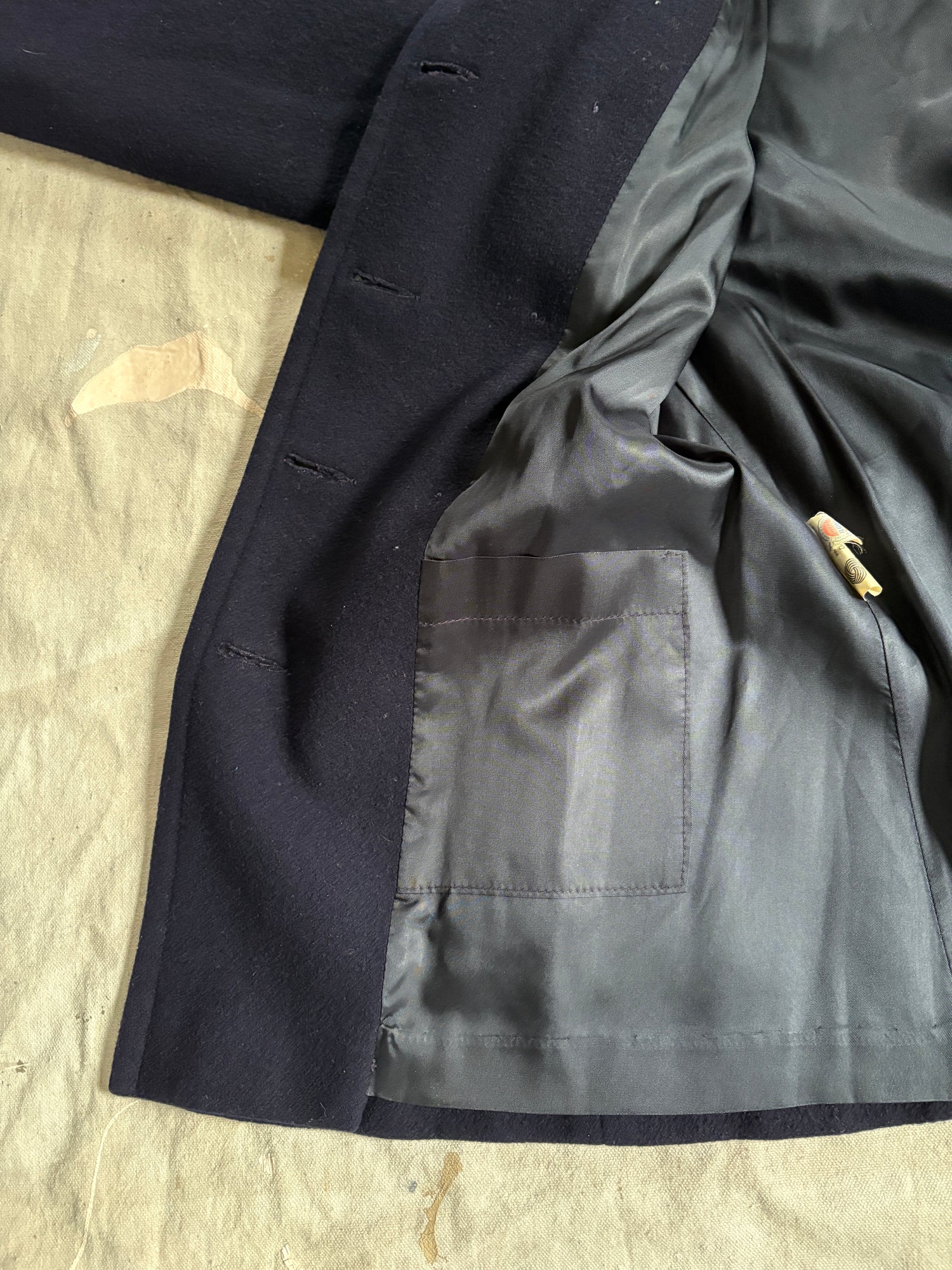 Leather buttons down the front with 2 spare buttons attached at the lining. Inner pockets as well. Wool outer with a cozy acetate lining.