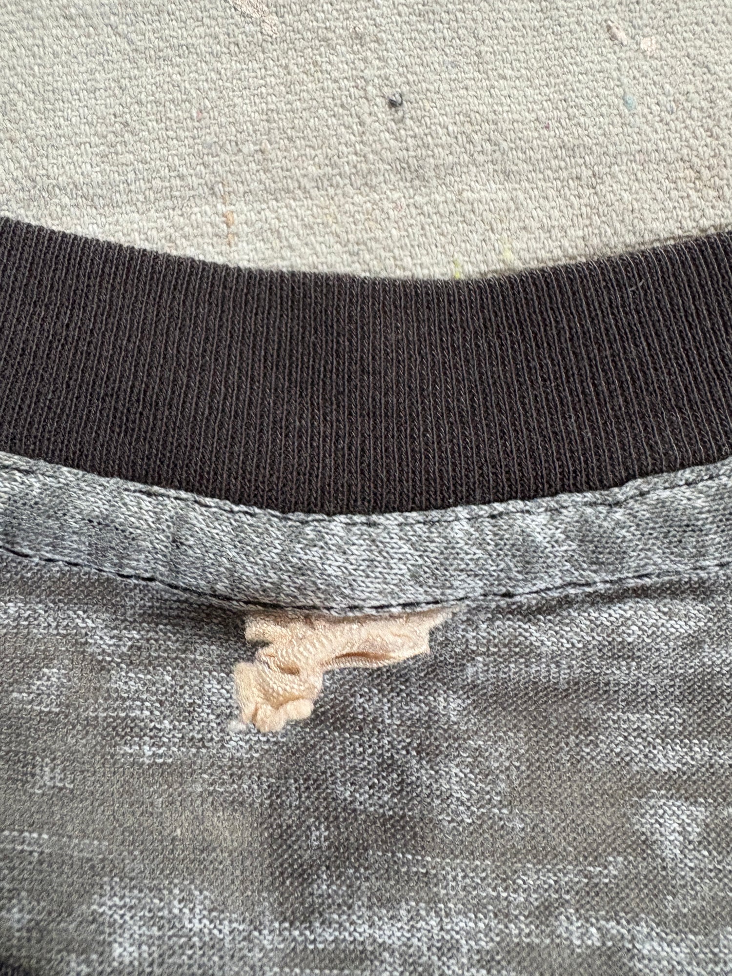 Worn thin. Mend at front. Staining. Please carefully review photos.