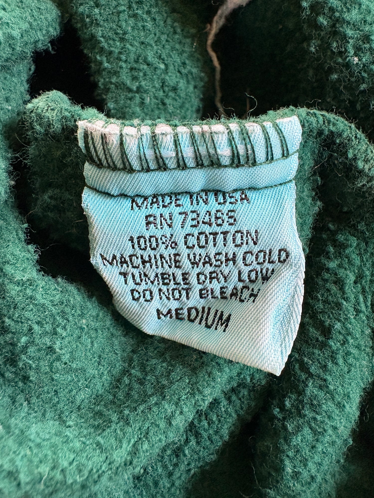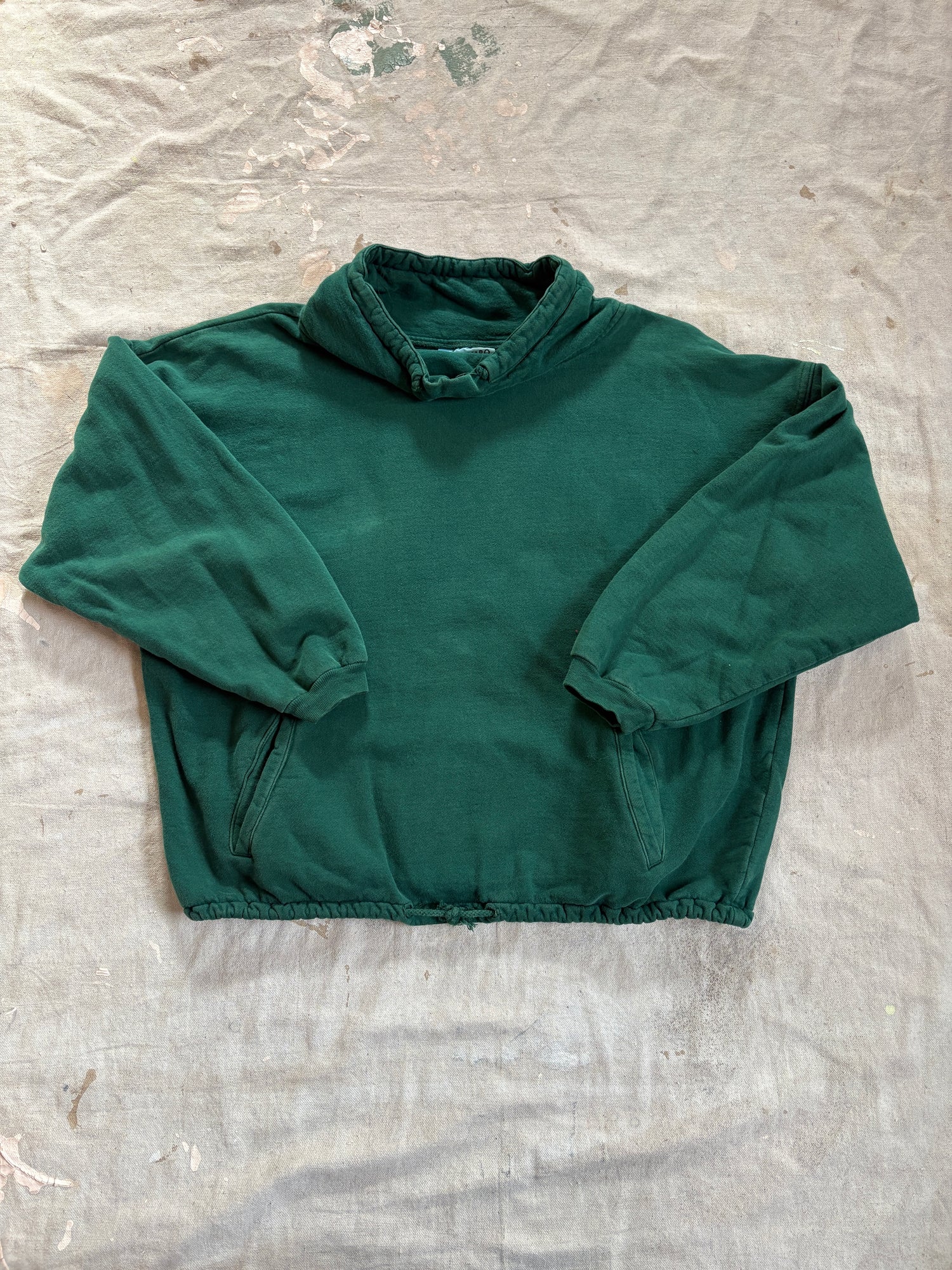 All cotton. Made in USA by Contempo Casuals. Drawstring at collar and waistband. Hand warmer pockets.